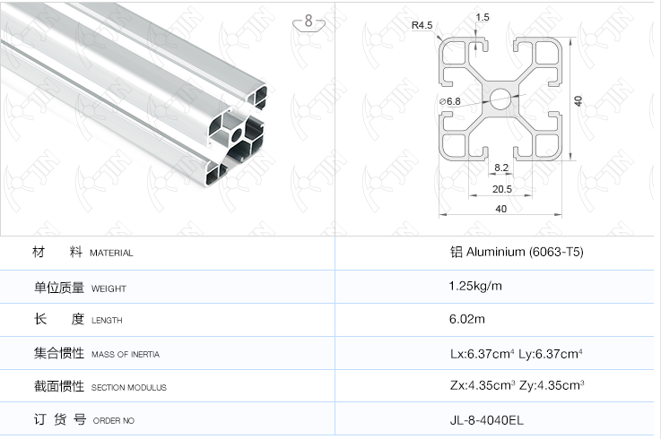 這款鋁型材的產(chǎn)品貨號是JL-8-4040EL,又被稱為40*40歐標(biāo)超輕型鋁型材,槽寬為8毫米,是槽8 系列的工業(yè)鋁型材,它的材料是:鋁合金Material Aluminum(6063-T5),單位質(zhì)量Weight:1.25kg/m,長度Length:6.01m,集合慣性 Mass of lnertia:lx:6.37cm4 ly:6.37 cm4,截面慣性 Section modulus:Zx:4.35 cm3 Zy:4.35 cm3,表面經(jīng)過陽極氧化白銀處理,美觀優(yōu)雅還具有抗腐蝕的特性。