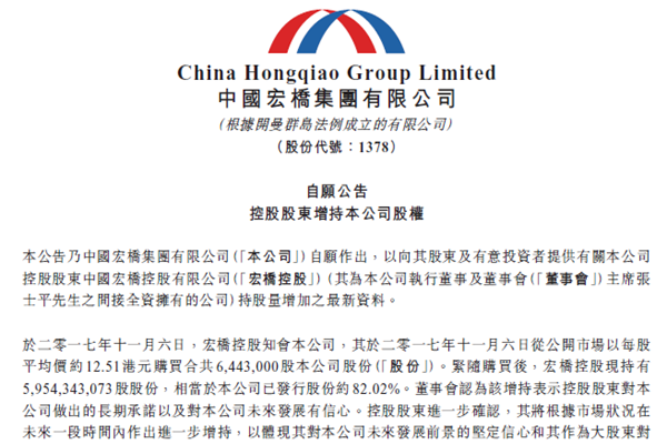 中國宏橋近日發(fā)布公告稱,其控股股東宏橋控股知會公司,將于2017年11月6日從公開市場以每股均勻價約12.51港元購置合共644.3萬股公司股份。緊隨購置后,宏橋控股現(xiàn)持有約59.54億股股份,相當于公司已發(fā)行股份約82.02%。記者從公開材料查詢后發(fā)現(xiàn),宏橋控股為公司執(zhí)行董事及董事會主席張士平間接全資具有的公司。