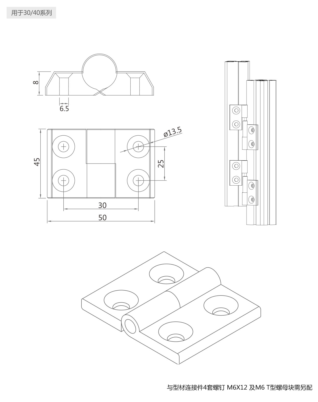 用于連接型材與型材或板之間的活動連接。連接后可脫卸,連接螺釘及螺母塊需另配。